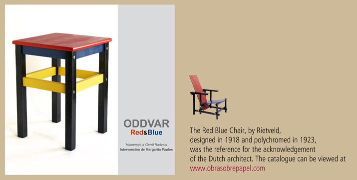 The Oddvar Red&Blue takes the polychroming from the Red Blue Chair in turn, is inspired on the combination of red, blue, black and yellow used by Piet Mondrian in his abstract compositions. Thus a certain complicity is set up between a piece that is currently published by the firm Cassina, and which is also displayed in the collection at the New York Museum of Modern Art, with a simple, elegant anonymous design by IKEA, produced by Paulos. The stool will be included in the Obra sobre Papel (Work on Paper) on line gallery collections, before the year-end, since this is a prototype, made in the summer of 2013.